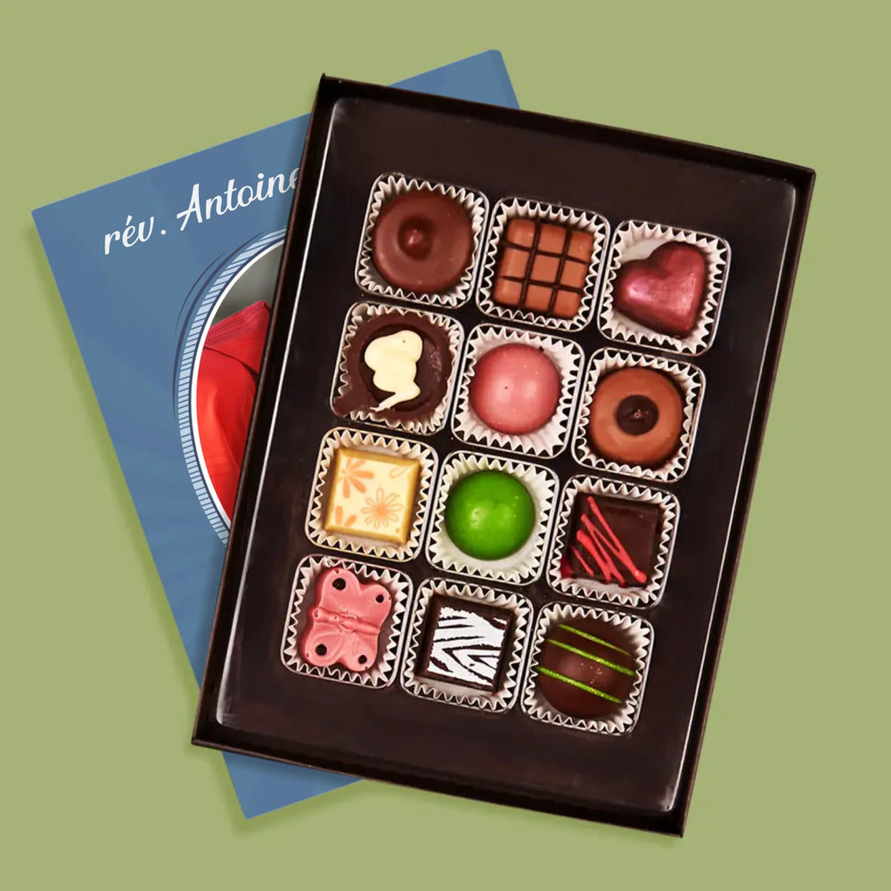 De délicieuses pralines au chocolat belge dans une boîte élégante avec personnalisation de votre choix.
