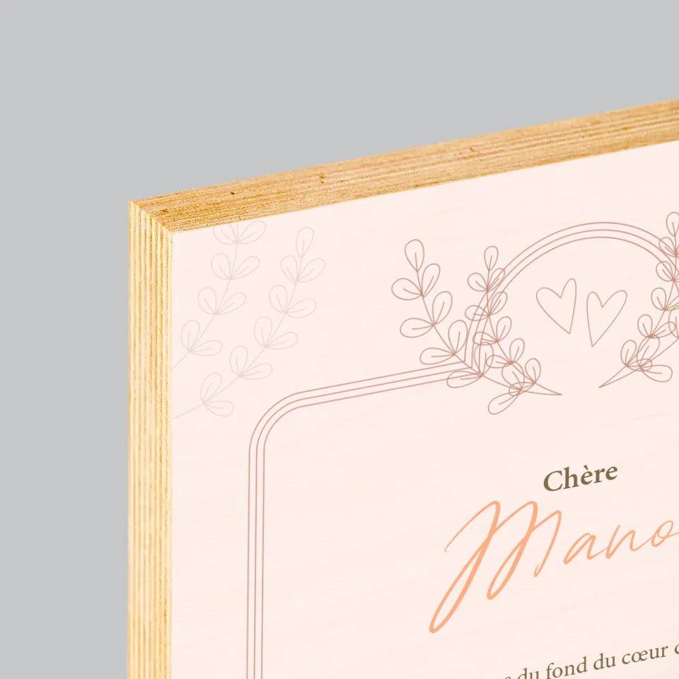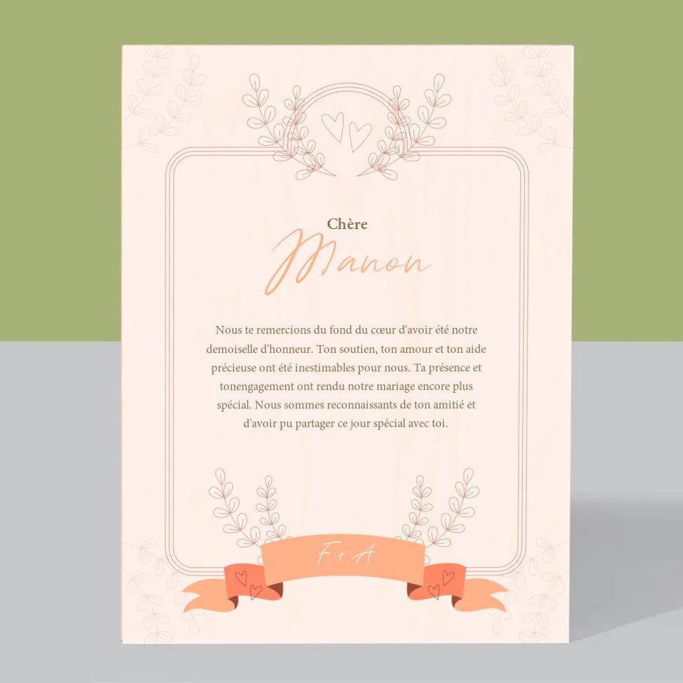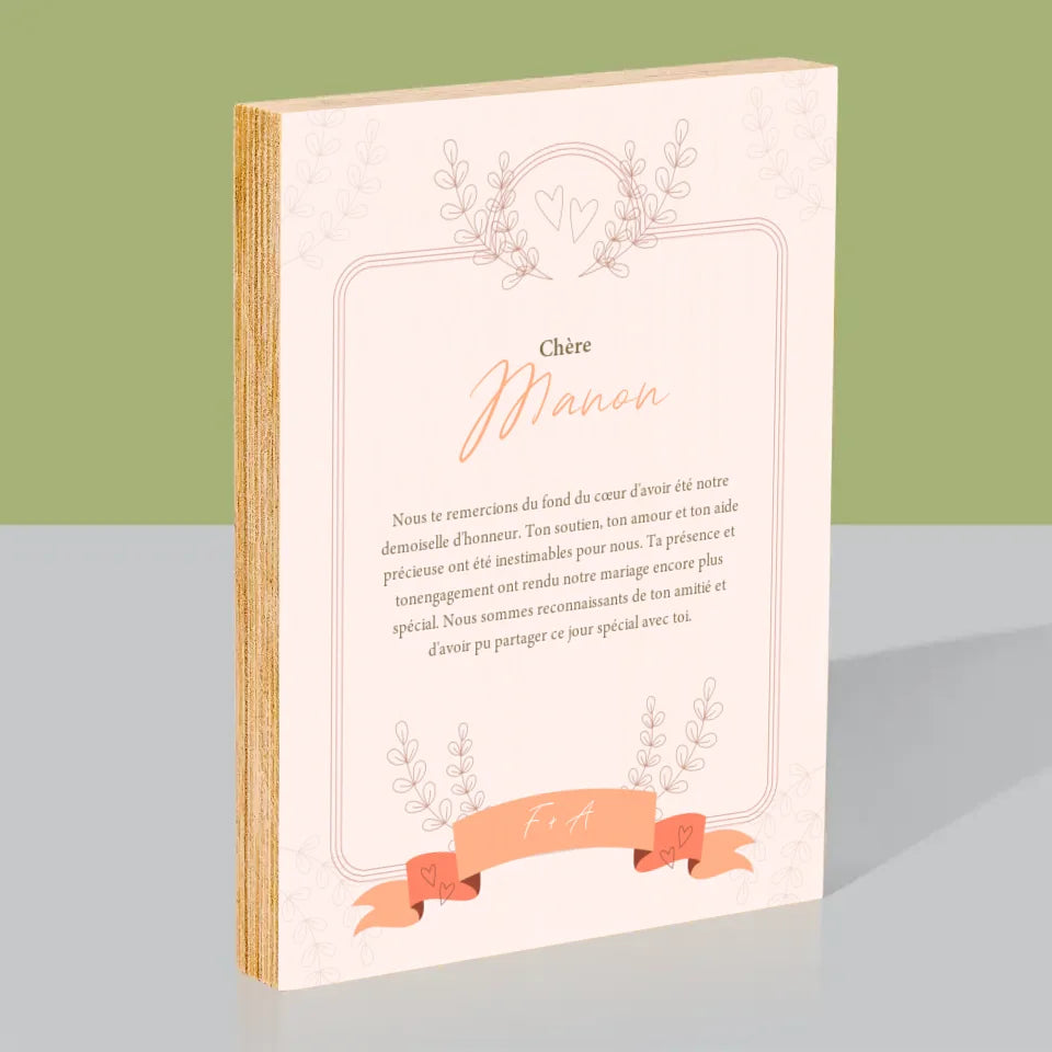 Le Prénom Et Un Texte: Remerciements Au Demoiselle D'Honneur - Impression sur bois - vertical