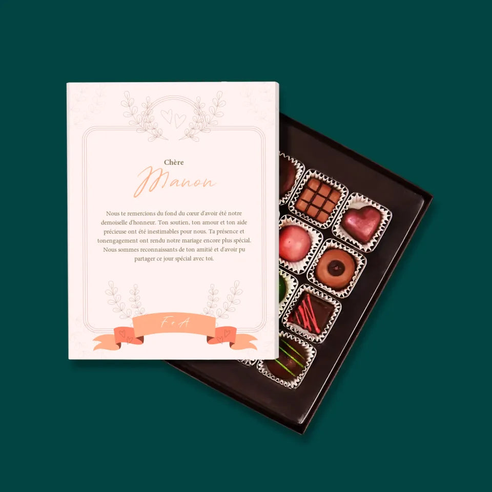 De délicieuses pralines au chocolat belge dans une boîte élégante avec personnalisation de votre choix.