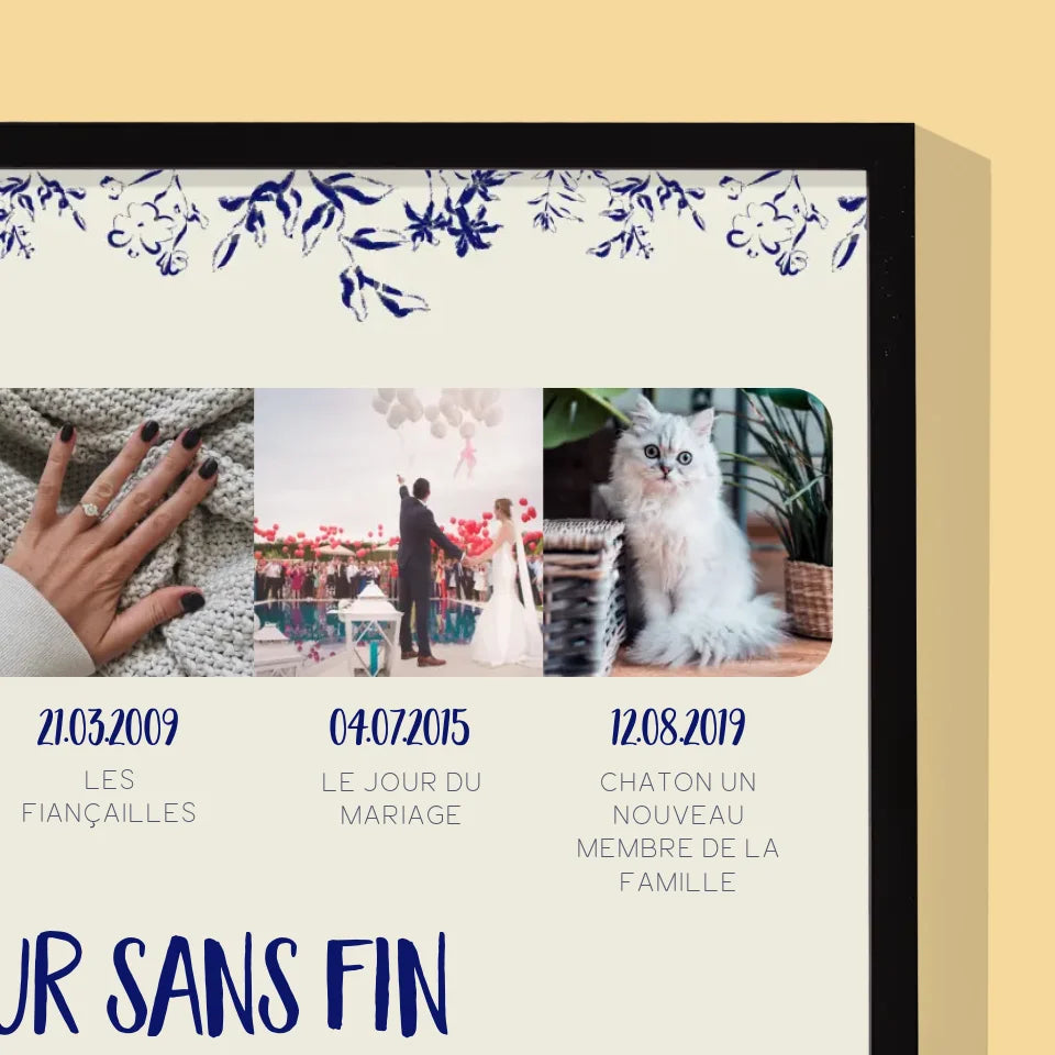 • L'impression est réalisée sur le papier photo de haute qualité et encadré dans la couleur de votre choix : or, blanc ou noir.